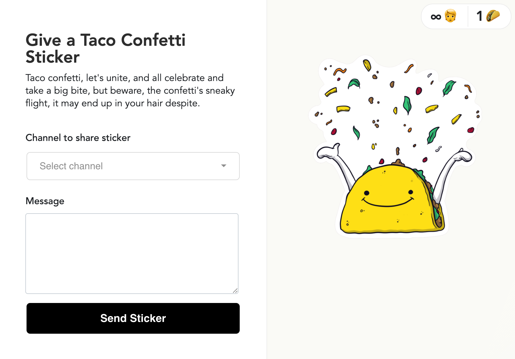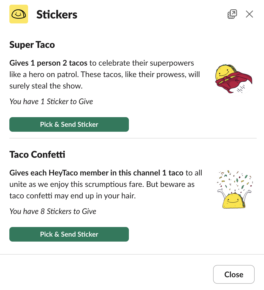 Stickers are a way to recognize groups of people without draining your daily taco balance. There are two components to Stickers: