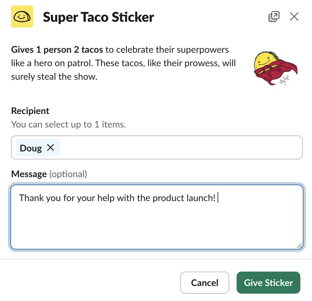 Stickers can be given directly from the Stickers page on your HeyTaco account. Choose the Sticker you'd like to give, and select 'Give Sticker'. Clicking that button will open up a new page where you will choose whom you'd like to give it to and in which channels, along with the message you want to add. Simply fill out the information, select 'Send Sticker' and it will be posted in channels you chose. Voila! As easy as that.